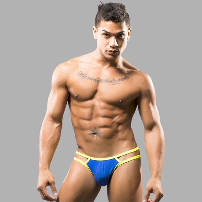 Синие мужские трусы-стринги с двойными бретелями.