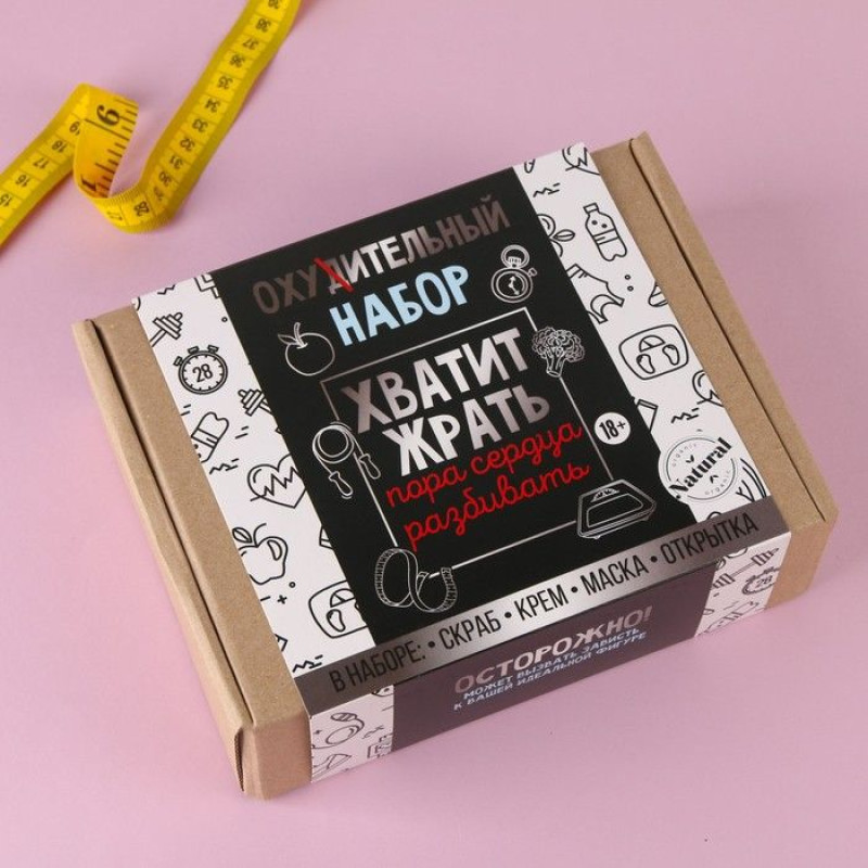 Набор антицеллюлитной косметики «Хватит жрать»: скраб, крем и маска.